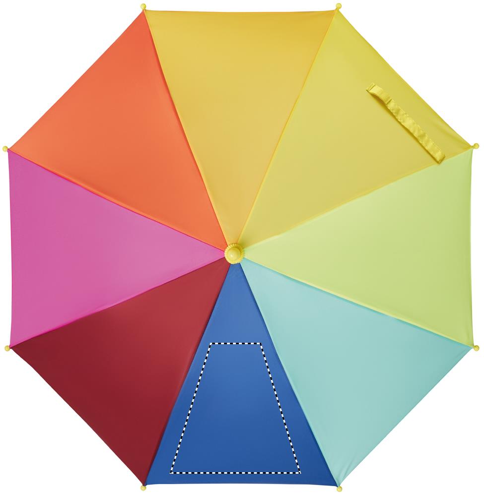 18'''' Regenschirm für Kinder aus 190T Pongee mit Regenbogenmuster. 8 Segmente. Stock und Stangen aus Fiberglas. Spitzen und Griff aus Kunststoff. Gebogener Griff. Manuelle Öffnung und Schließung.