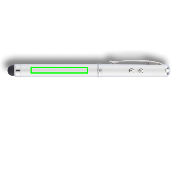 Schwarzschreibender Kugelschreiber mit Stylus-Funktion und integriertem Laserpointer sowie kleiner Leuchte.