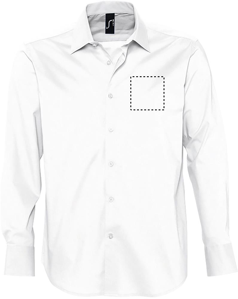 SOL'S BRIGHTON Herrenhemd 140g. Aus Elasthan-Baumwolle. Der körpernahe Schnitt sorgt für Halt und Bequemlichkeit. Fashion-Produkt. Fitted. Langarm. 1-Knopf-Kragen. 2-Knöpfe-Ärmelbündchen mit Aufschlag im Kapuzinerstil. Leiste mit 7 Knöpfen in harmonierendem Farbton. Material: 97% Baumwolle - 3% Elasthan. OEKO-TEX®. Verkauf nur inklusive Werbeanbringung.