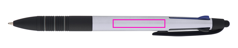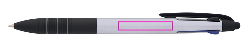4in1 Kugelschreiber aus Kunststoff mit 3 verschiedenen Schreibfarben (blau, rot und schwarz) + Touchfunktion und gummierter Griffzone. Ihre Werbung drucken wir auf den Schaft.
