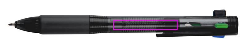 Kugelschreiber aus Kunststoff mit 4 farbigen Schreibminen (blau, schwarz, rot und grün). Ihre Werbung wird unterhalb des Clips aufgedruckt.