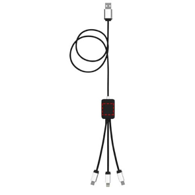 Beleuchtetes Logo-Ladekabel mit Gummi- und Metalloberfläche, ausgestattet mit drei Steckern (Typ-C, Android, iPhone). Es können bis zu drei Geräte gleichzeitig aufgeladen werden. Länge der Kabel (einschließlich Stecker): 10 cm. Gesamtlänge des Kabels: 1 Meter. Kabel aus recyceltem PET-Kunststoff und die Verpackung besteht aus recyceltem Papier und recyceltem Kunststoff.