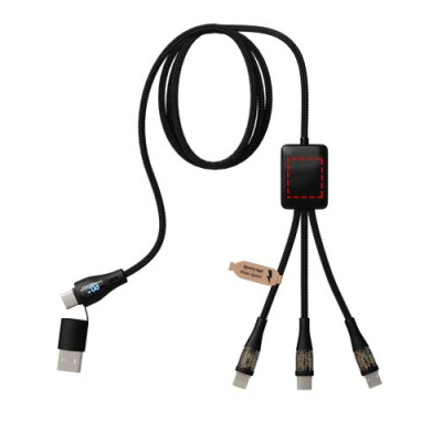Das 5-in-1 60W Schnellladekabel aus recyceltem PET verfügt über ein beleuchtetes, beidseitig angebrachtes Logo und bietet 3 Anschlüsse (Typ C, iPhone und Android). Der duale USB-A- und USB-C-Eingang macht das Kabel 100 % kompatibel mit den neuesten Computermodellen. Das Kabel kann mehrere Geräte gleichzeitig aufladen. Geliefert mit einer wiederverwertbaren Tasche aus TPU und einer Einlage aus recyceltem Papier. Länge des Kabels: 1 Meter.
