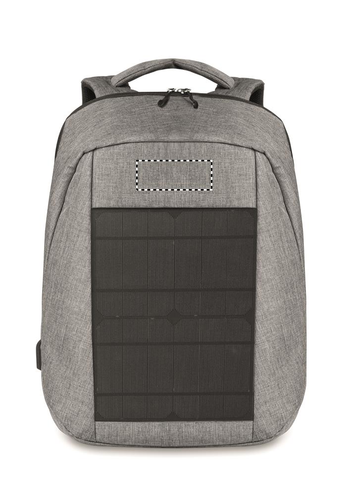 2 tone 600D Polyester backpack with built-in 10W solar panel charger with USB port and cable. Charging time telephone is about 5-6 hours in the direct sun. 2 main compartments. Several inside pockets Includes one internal 13 inch laptop compartment. Padded back and shoulder straps. Additional pocket for Tablet compartment.