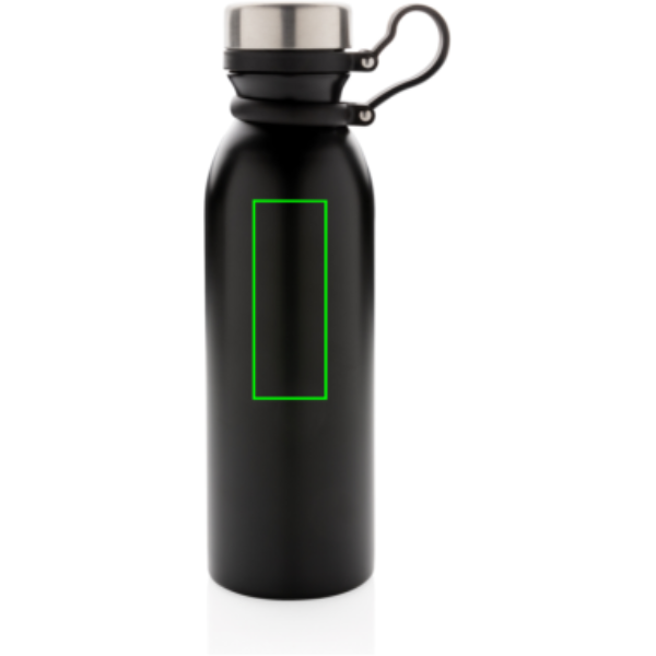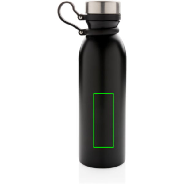 Leakproof copper vacuum insulated bottle with black silicone carry loop. One handed drinking means no need to store or carry the lid. Comes with a double-wall vacuum construction with copper insulation which means it keeps drinks hot for up to 8 hours and cold for up to 24 hours. The construction prevents condensation on the outside of the bottle. Content: 600 ml.