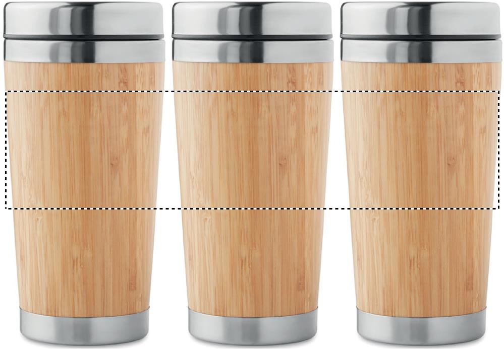 Double wall stainless steel flask with bamboo cover and PP lid. Capacity: 400 ml. Bamboo is a natural product, there may be slight variations in colour and size per item, which can affect the final decoration outcome.