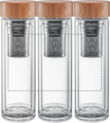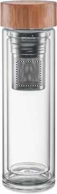 Double wall in high borosilicate glass bottle and bamboo lid with tea infuser. Capacity: 400 ml. Bamboo is a natural product, there may be slight variations in colour and size per item, which can affect the final decoration outcome. Leak free. Laser engraving is not possible on borosilicate glass.