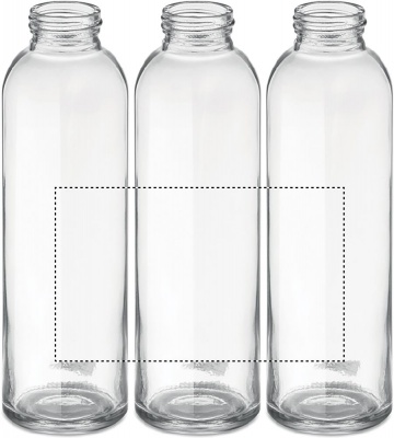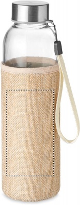 Drinking bottle in glass with neoprene style and jute mixed material pouch. Capacity: 500 ml. Not suitable for carbonated drinks. Leak free.