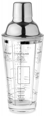 Glass cocktail shaker with stainless steel lid with strainer. Printed cocktail recipes and measurements on the glass. Capacity: 400 ml.
