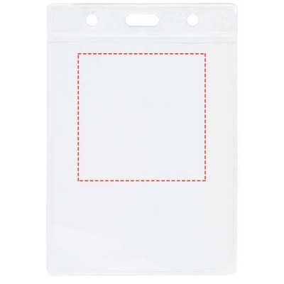 Badge holder with insert on the back and opening on top to attach to a lanyard or roller clip. This item fits a card of 9,4 x 8,3 cm.