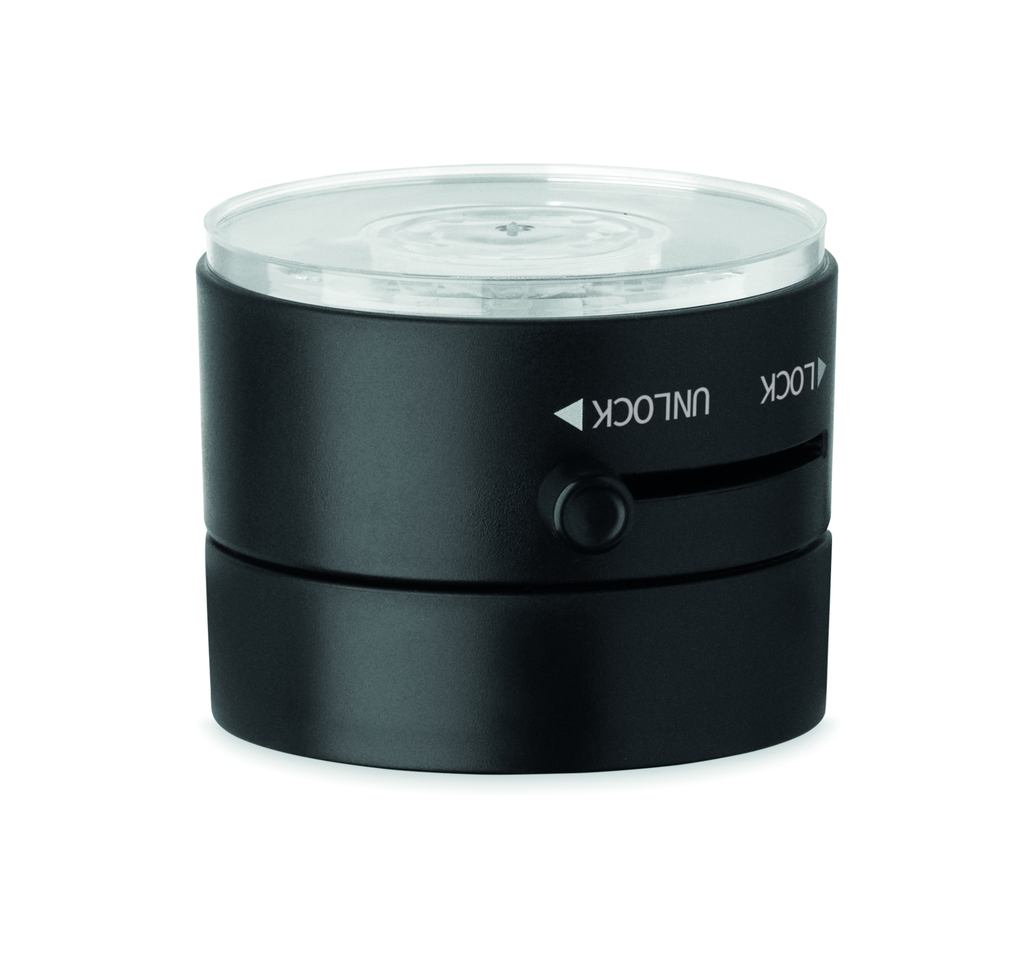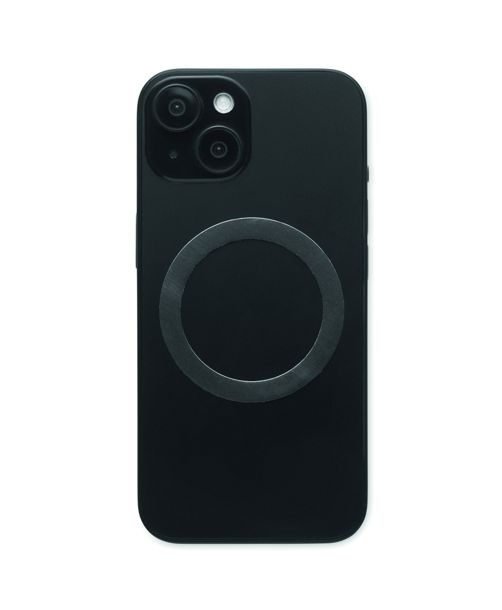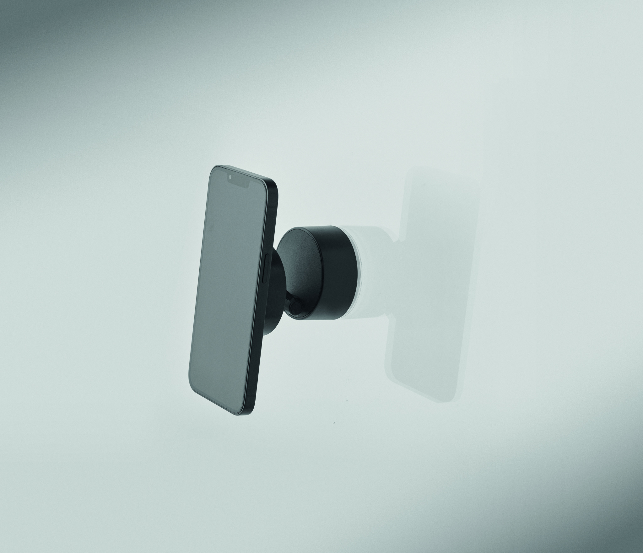 Magnetic phone holder in ABS. Vacuum suction hold. Compatible with iPhone® 12 and newer. Including additional magnetic metal ring to support charging of other non-magnetic wireless chargeable phones.