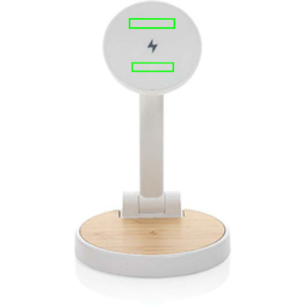 15W 2-in-1 fast wireless charger with magnetic charging made with with RCS (Recycled Claim Standard) certified recycled ABS. Total recycled content: 30% based on total item weight. RCS certification ensures a completely certified supply chain of the recycled materials. Bamboo wireless charging area made from FSC 100% bamboo. With magnetic 15W charger and one 5W charger for other wireless chargeable items like earbuds. With one USB A port to charge items via cable. Item and accessories PVC free. Including 120cm type C charging cable made from RCS certified recycled TPE. Packed in FSC mix kraft box. 9V/3A; W: 9V/1.1A; 9V/1.67 A/(15W), Earbuds: 5V/1A (5W), USB output 5V / 2.1A. PVC free.