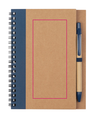Spiral-bound notebook with 120 blank pages made from recycled paper (cover 250 gsm, pages 60 gsm) and a pen loop. The matching ballpoint pen made from recycled paper, featuring a non-replaceable blue-writing refill and ABS plastic accents, is included.