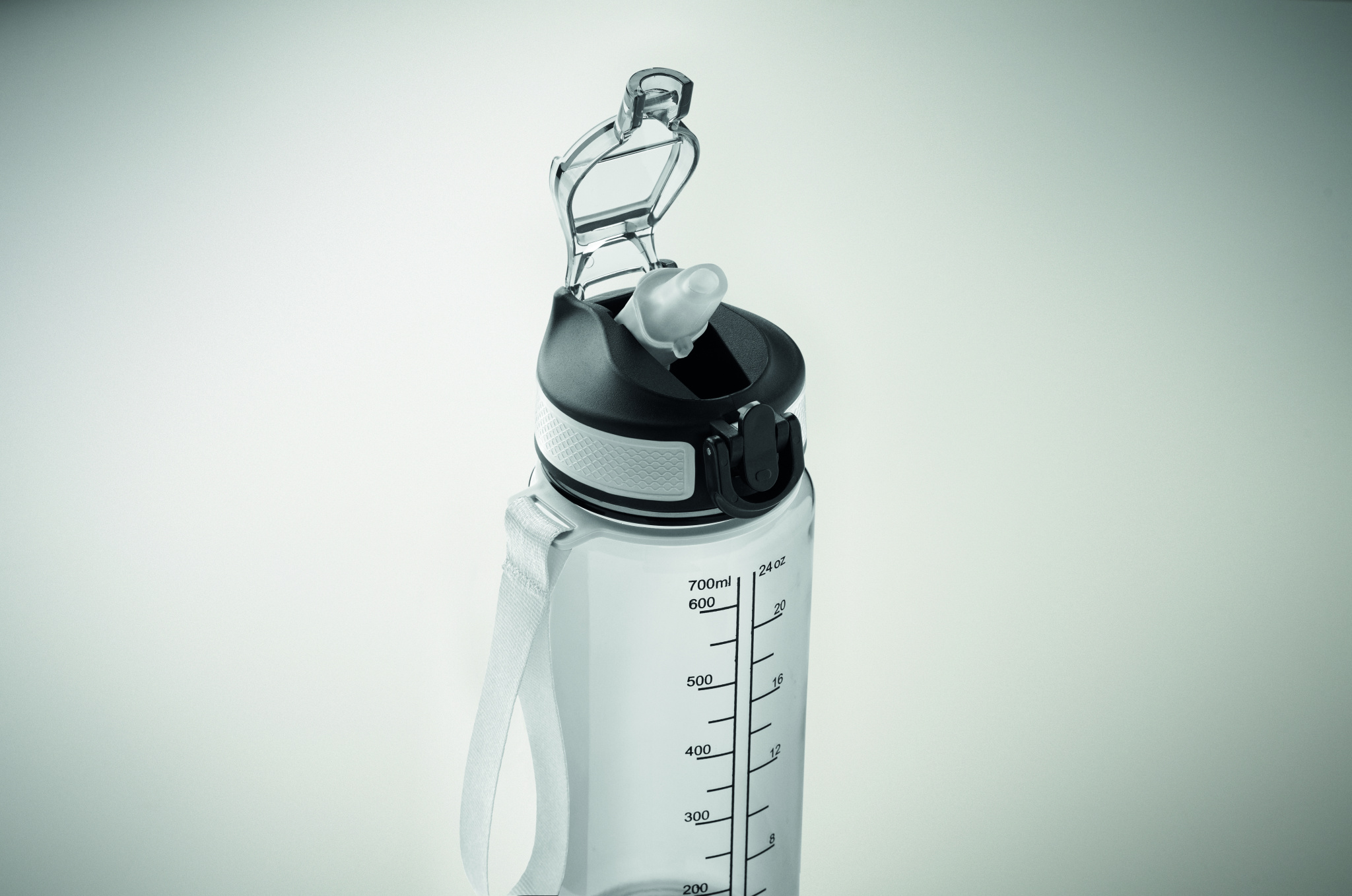 Motivational sports water bottle in RPET with integrated straw, soft silicone mouth piece, one hand opening flip top lid, safety lock. With carrying strap in RPET satin. Capacity 700 ml. Leak free.