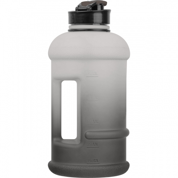 Extra-large drinking bottle made of plastic with a drinking indicator and a capacity of 1,300 ml. The grip indentations ensure a secure hold while drinking, and the velvety surface provides a particularly pleasant feel. Your logo is applied to the lower third of the bottle.