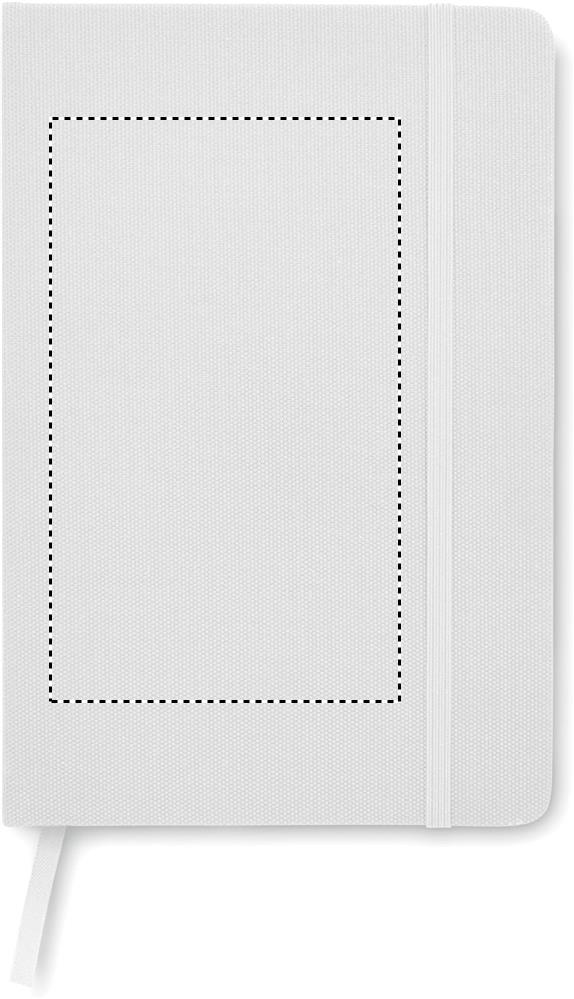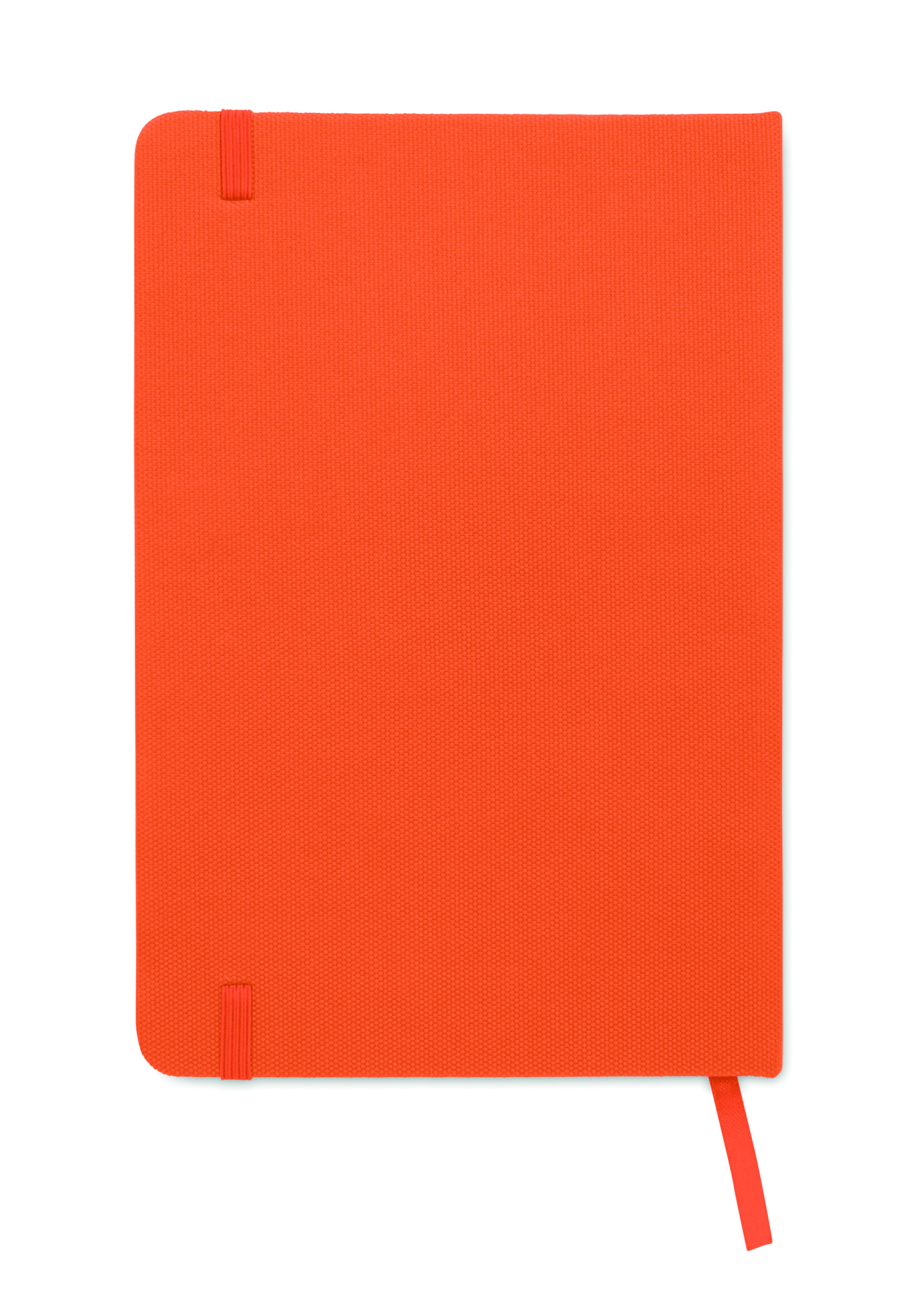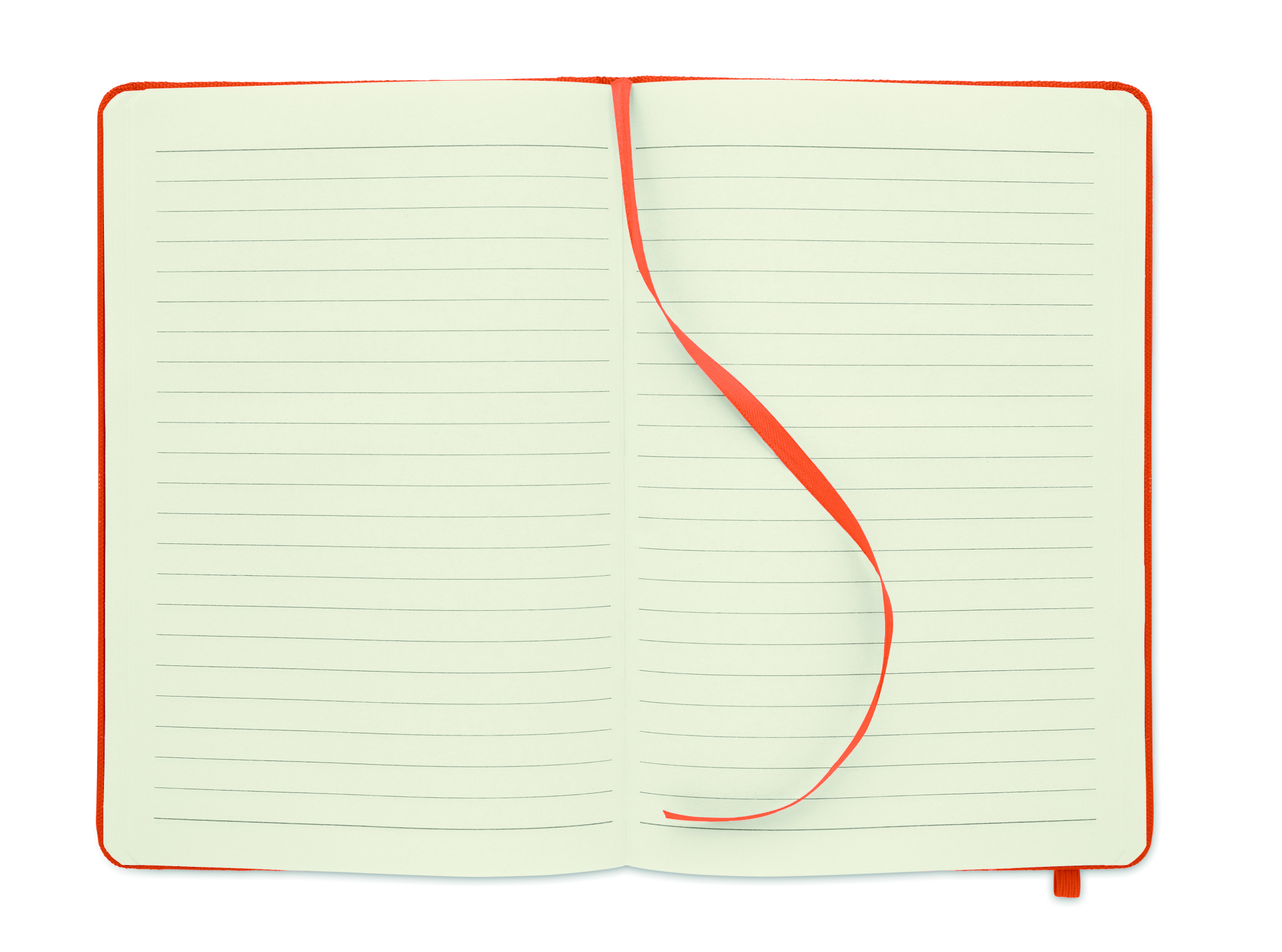 A5 märkmik kõva 600D RPET kaanega. Casebound. 160 joonega taaskasutatud paberilehte (80 lehte). Kokkusobiv elastne sulgemisrihm ja paelaga järjehoidja.