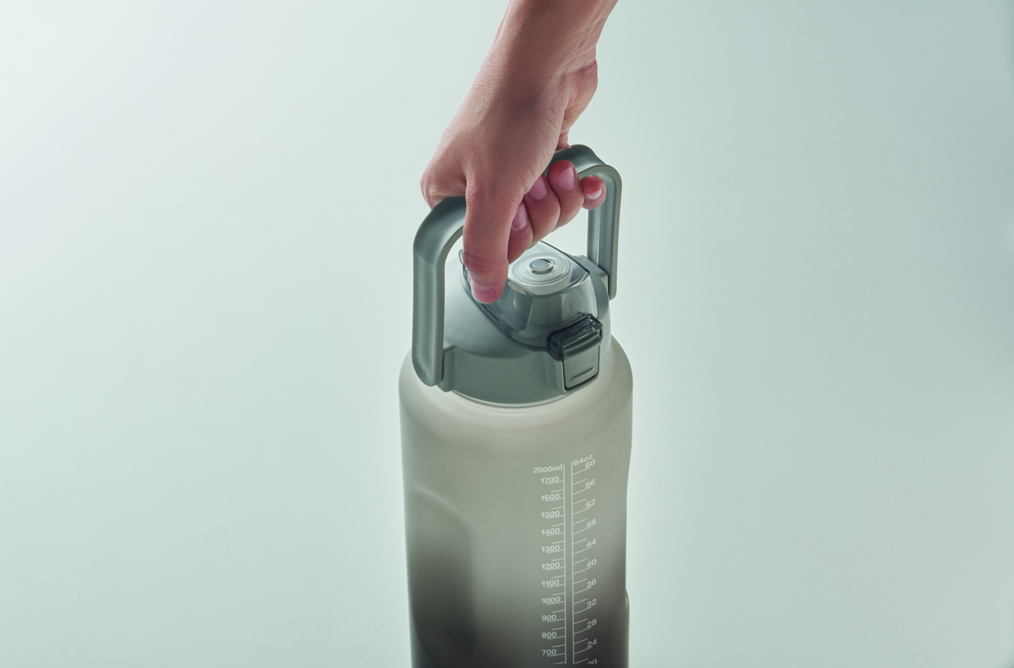 Motiveeriv mõõteskaalaga RPET-ist veepudel. Ühe käega avatava klapiga kaane, kõrre, turvaluku ja käepidemega. Lekkekindel. Maht: 2000 ml