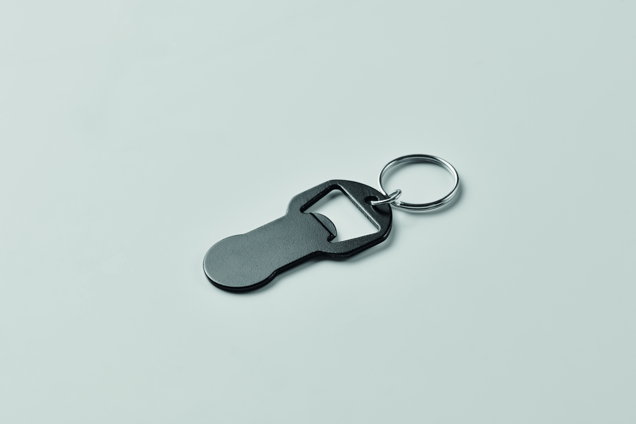 Pudeliavaja võtmehoidja, mis on valmistatud taaskasutatud alumiiniumist, rauast rõngaga.