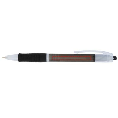 Värviline klikiga pastapliiats läbipaistva silindri ja sobivat värvi kummeeritud käepidemega.