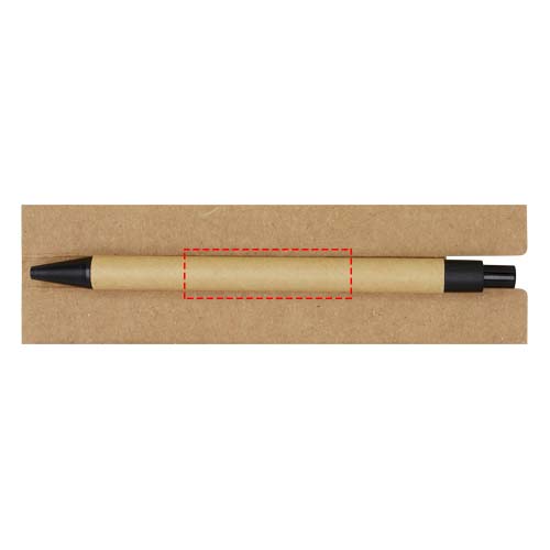 Kleepuv pastapliiatsiga märkmik. Märkmikus on 30 lehte valget 70 g/m2 joonelist paberit (8 x 12 cm). Sellel on ka 25 mitmevärvilist (5 x 1,2 cm) ja 25 kollast (7,5 x 7,5 cm) kleeppaberit, mõlemat tüüpi paberiga 70 g/m2. Pastapliiatsi toru on valmistatud taaskasutatud paberist. Tindi värv: must. Kirjutamise pikkus: 1000 meetrit. Otsa suurus: 1,00 mm.