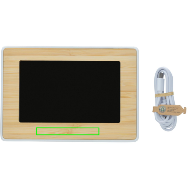 Suur LED-ekraaniga kell, mis on valmistatud RCS (Recycled Claim Standard) sertifitseeritud ringlussevõetud ABS-ist ja FSC® 100% bambusest. Taaskasutatud kogusisaldus: 76% kauba kogukaalust. RCS-sertifikaat tagab taaskasutatud materjalide täielikult sertifitseeritud tarneahela. Kvaliteetse LED-ekraaniga. Funktsioonid: kell, äratus, edasilükkamine, temperatuur, 12/24 tunni valik. Kaasa arvatud 100 cm C-tüüpi laadimiskaabel, mis on valmistatud RCS-sertifikaadiga taaskasutatud TPE-st. Pakitud FSC® mix kraft karpi.