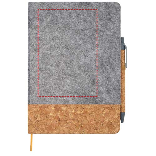 A5 kõvakaaneline märkmik on valmistatud korgist ja taaskasutatud vildist ning sellel on 80 joonega 70 g/m² paberilehte, elastne sulgur, lindimarker ja pliiatsi aas. Pastapliiatsi nupp, klamber ja ots on valmistatud taaskasutatud plastikust ning silinder on valmistatud korgist. Pliiatsi tint: must. Kirjutamise pikkus: 600 meetrit. Otsa suurus: 1,0 mm.