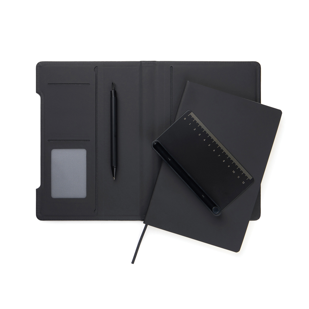 See multifunktsionaalne märkmik on nutikas 4-ühes lahendus ühendades endas praktilisuse, paindlikkuse ja disaini. Valmistatud RCS-sertifitseeritud taaskasutatud paberist ja klassikalise Baltimore'i mati PU-kattega kaanega, mis muudab selle visuaalselt atraktiivseks kui ka funktsionaalseks. Magnetiline joonlaud toimib nii joonlaua kui ka pliiatsihoidjana. Sisaldab integreeritud telefonialust. Sisemuses on kaardihoidja taskud. Märkmik sisaldab 80 lehte / 160 joonega lehekülge, pakkudes palju ruumi märkmete, planeerimise ja ideede jaoks. See on ideaalne kaaslane koosolekuteks, reisimiseks või igapäeva sündmuste planeerimiseks. Taaskasutatud sisu kogumaht: 70% eseme kogukaalust. Sertifitseeritud Control Unioni poolt, CU1162221.