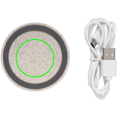 Juhtmeta laadija, mis on valmistatud nisukiust (15%), mis on segatud ABS-iga, et laadida kõiki juhtmeta seadmeid. Silikoonrõngaga, mis ei lase telefonil ümber libiseda. LED-indikaator süttib seadme laadimise ajal. Ühildub kõigi QI-toega seadmetega, nagu Android uusim põlvkond, iPhone 8 ja uuemad. Sisend: 5V/1,5A. Juhtmeta väljund: 5V/1A, 5W. Kaasas 50 cm PVC-vaba TPE mikro-USB kaabel.