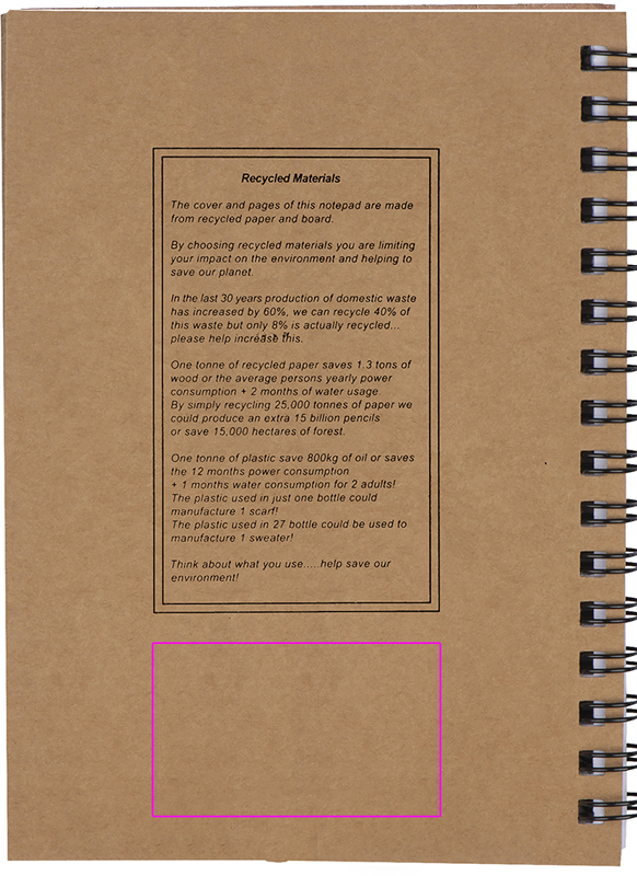 Muistilehtiö kierrätyspahvista, jossa on 120 sivua kierrätyspaperia ja sinisellä musteella kuulakärkikynällä. Painamme logosi kanteen.