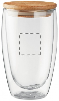 Kaksiseinäinen 450 ml borosilikaattilasi bambukannella, kannessa silikonirengas. Luonnollisen materiaalin (bambu) vuoksi, tuotteiden värissä/ koossa saattaa olla erinäisyyksiä ja tämä voi vaikuttaa painatuksen lopputulokseen.