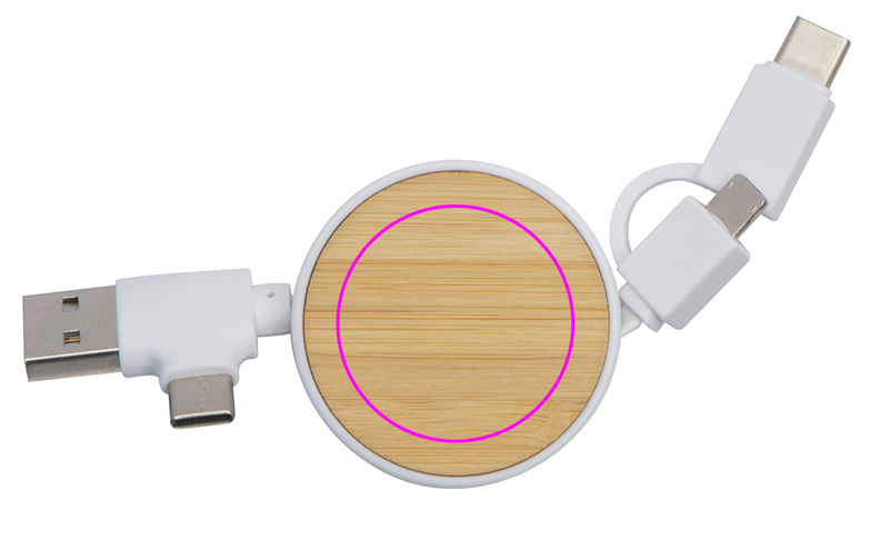 Jatkettava latauskaapeli muovikotelossa, jossa on bambulevy, USB, 2 C-Type ja iOS-sovitin. Logosi painetaan bambuosaan.