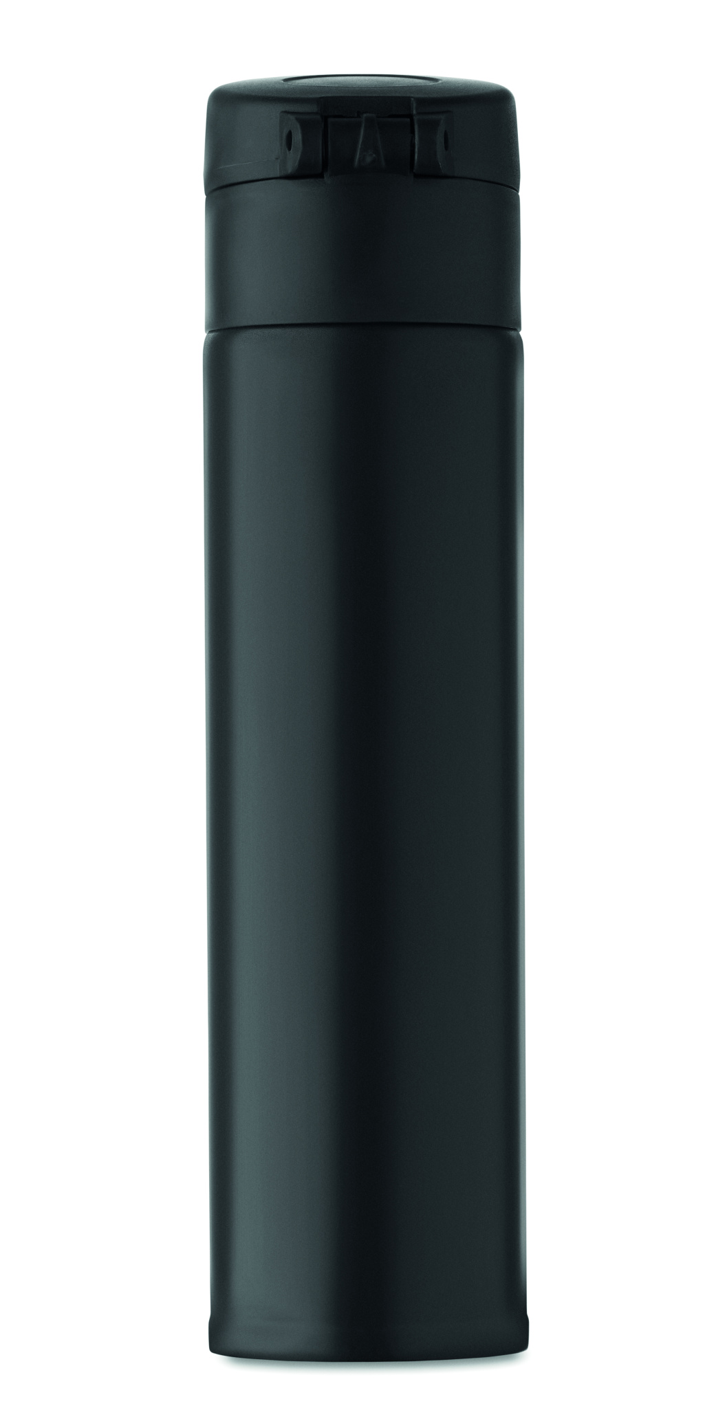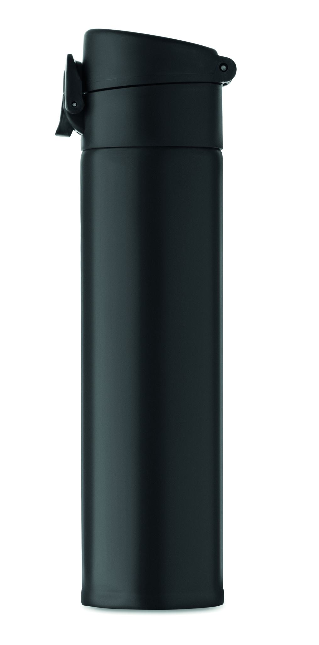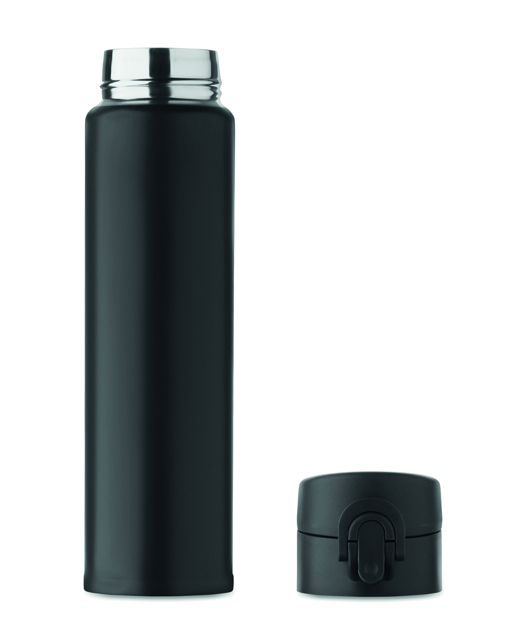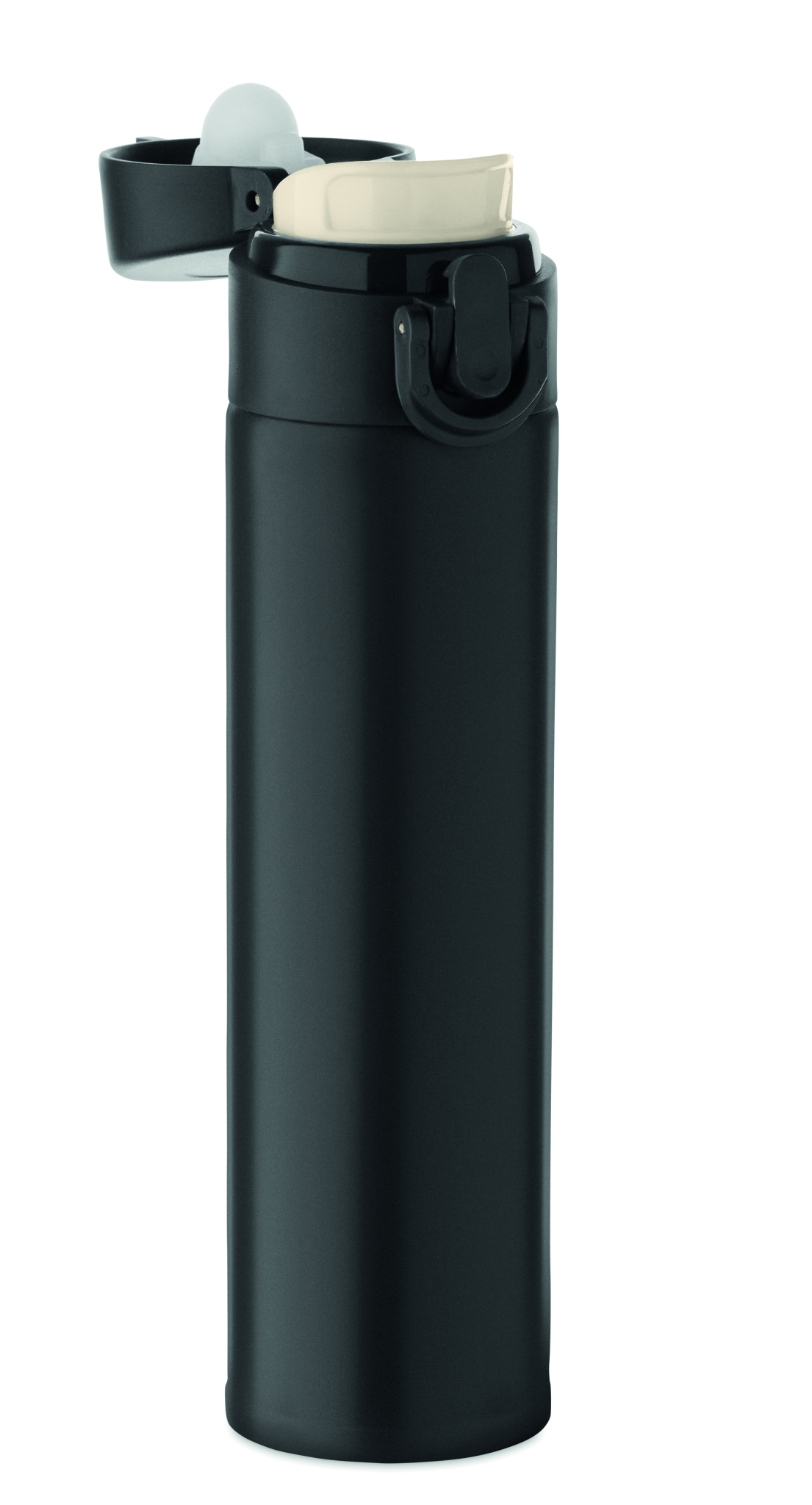 Kaksinkertainen juomapullo kierrätetystä ruostumattomasta teräksestä (90 % kierrätettyä ruostumatonta terästä ja 10 % ruostumatonta terästä), jossa on turvalukko kannessa ja painamalla avattava vaihtoehto. Vuotamaton. Tilavuus: 300 ml.