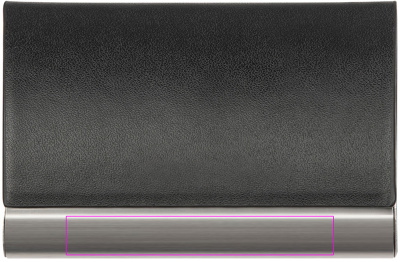 Metallinen käyntikorttiteline, jossa keinonahkainen kansi ja magneettisuljin. Logo on laseroitu metallinauhaan.