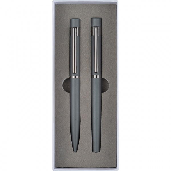 Tyylikkyyttä ja mukavuutta yhdessä setissä! Sisältää kuulakärkikynän ja rullapallon, joissa molemmissa on sinisillä kirjoituksella täyttöjä ja kumitettu pinta optimaalisen pidon ja tyylikkään muotoilun takaamiseksi. Täydellinen jokapäiväiseen käyttöön tai henkilökohtaiseksi lahjaksi.