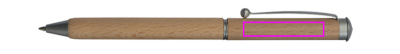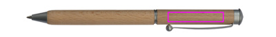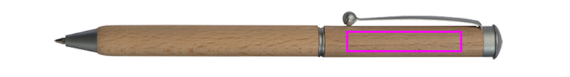 Kierremekanismilla varustettu puinen kuulakärkikynä, jossa on sinikirjoitusmetallitäyttö ja puinen kotelo. Logosi on kaiverrettu klipsien alle.