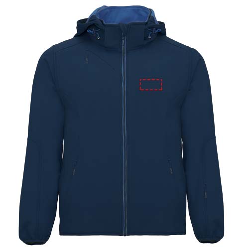 Kaksikerroksinen urheilullinen softshelltakki. Kontrastivärisessä vetoketjussa leukaa suojaava osa ja vedin. Lämmin sisäpuoli kontrastiväristä mikrofleeceä. Kaksi sivutaskua ja yksi rintatasku piilovetoketjuilla ja vetimillä. Tasku vasemmassa hihassa. Hihansuissa ja helmassa saman sävyinen joustava reuna. Irrotettava huppu kontrastivärisellä mikrofleece-vuorilla. Irrotettava tuotemerkki. Vedenpitävä. Tuulenpitävä. Kuvan miesmalli on 185 cm pitkä ja hänellä on päällään koko M, kuvan naismalli on 174 cm pitkä ja hänellä on päällään koko S.