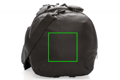 Kevyt 1680D- ja 600D-polyesterilaukku, 2-in-1. Toimii sekä reppuna että kassina. Tilava päälokero, jossa U-muotoinen, vetoketjukiinnitteinen yläosa, sivulla lokero kengille tai likavaatteille sekä vetoketjullinen tasku. Takana pullotelinetasku ja nopeapääsyinen pikkutasku. Edessä vetoketjutasku, jossa 2 RFID-suojusta. Säädettävät olkahihnat mukavaan kantamiseen eri tavoilla. Ei sisällä PVC:tä.