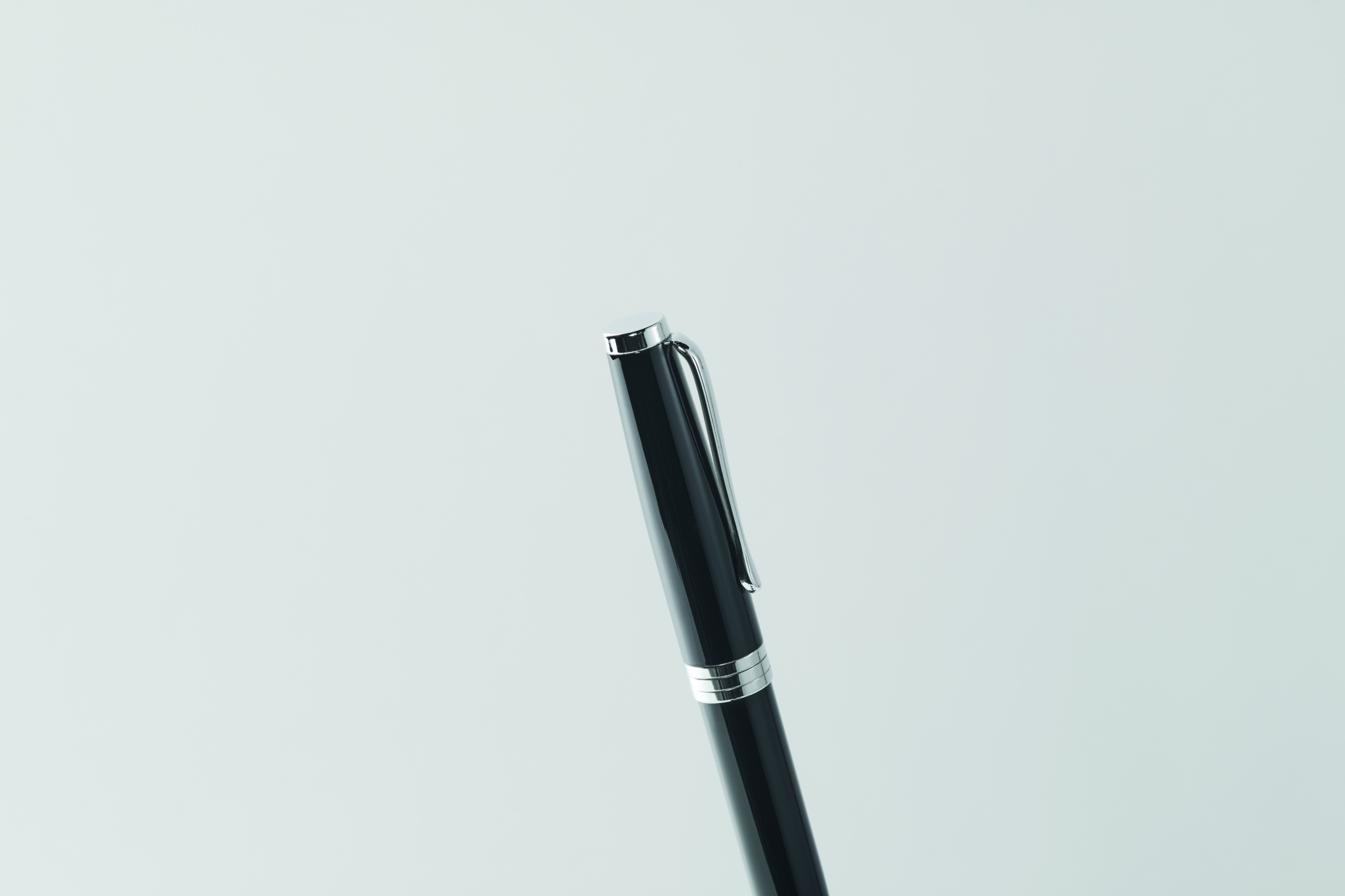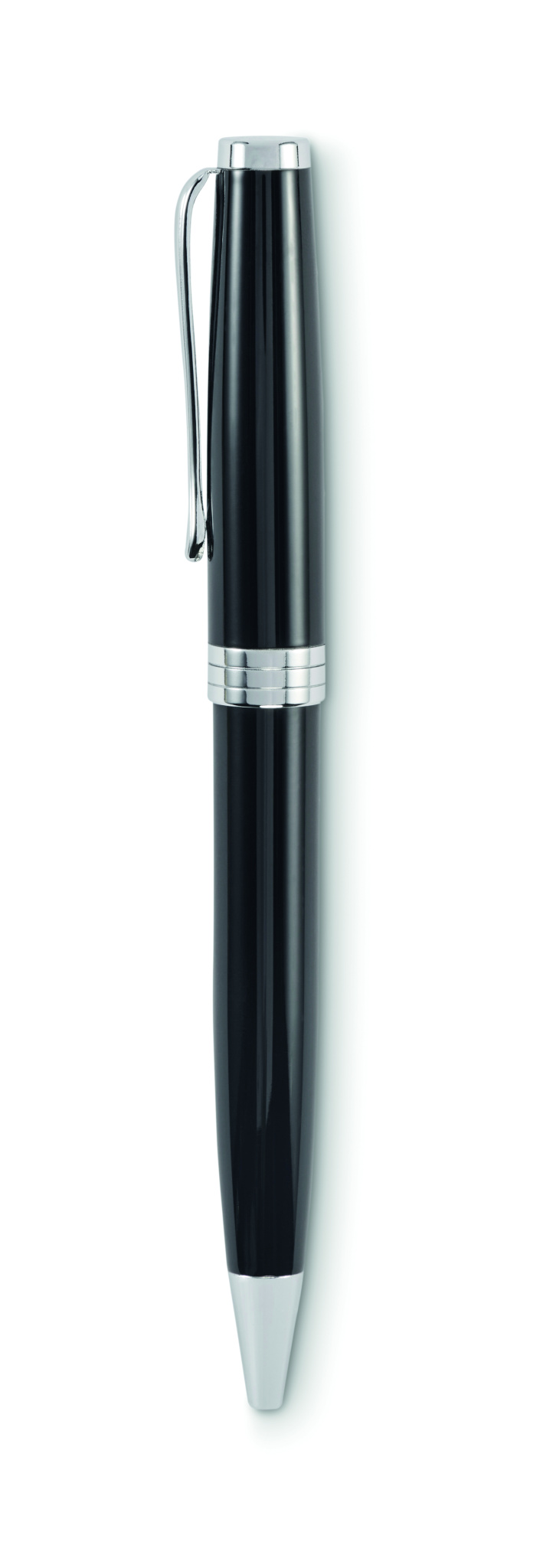 Kierrettävästä ruostumattomasta teräksestä valmistettu kuulakärkikynä. Sininen muste. Toimitetaan lahjapakkauksessa.