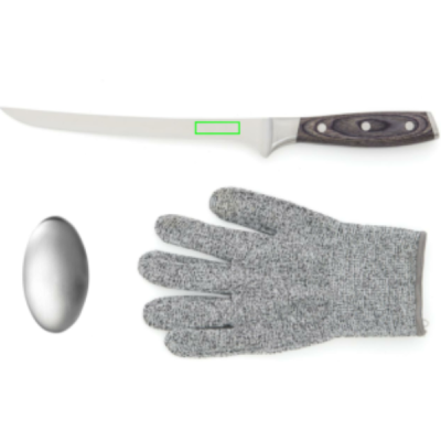 Täydellisessä kalankäsittelysetissä on fileerausveitsi, suojakäsine ja metallisaippua. Metallisaippua poistaa käsistä mm. kalan ja sipulin hajut. Käsineen avulla saat kalasta pitävän otteen ja se suojaa kättäsi veitsen viillolta. Veitsi on valmistettu saksalaisesta laatuteräksestä (X50CrMoV15) ja sen kahva on kestävää ja kaunista Pakkawoodia Kahvasta saa hyvän otteen, veitsi on tasapainoinen ja leikkaa erittäin hyvin.Koko: pituus 33 cm (terä: 21 cm).