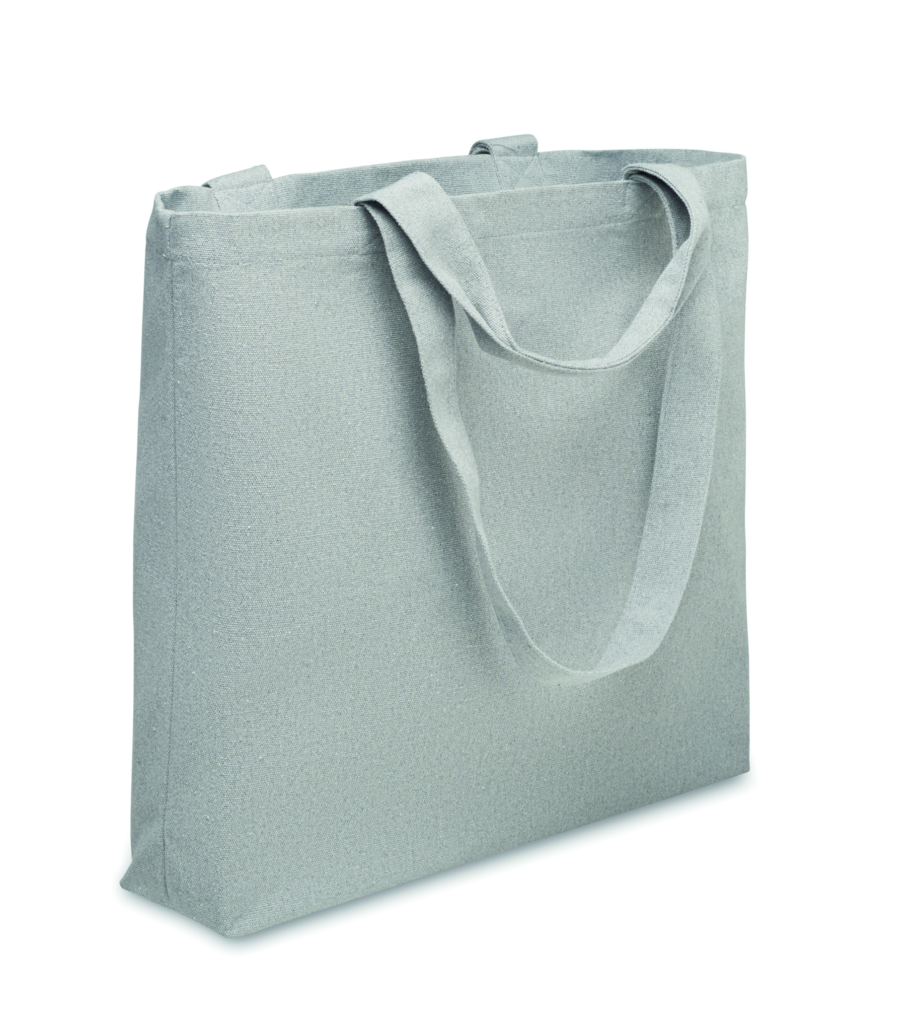 Pirkinių/paplūdimio krepšys iš perdirbtų audinių (60 % perdirbtos medvilnės, 40 % perdirbto poliesterio) su trumpomis ir ilgomis rankenomis. 320 gr/m².