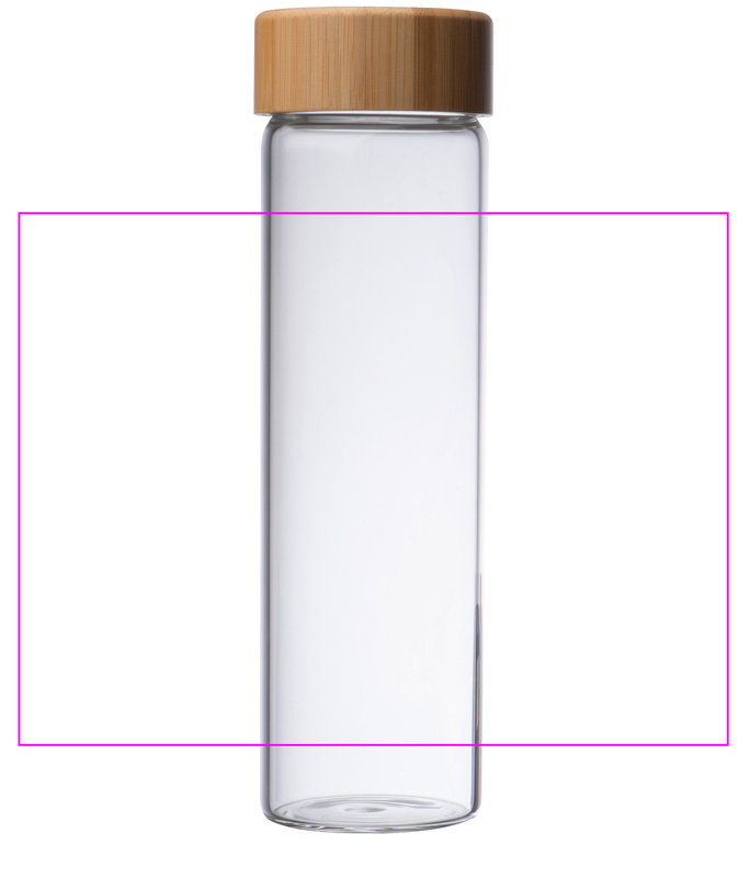 Stiklinis butelis su bambukiniu dangteliu ir 500 ml talpos. Jūsų logotipas bus išgraviruotas ant dangtelio.