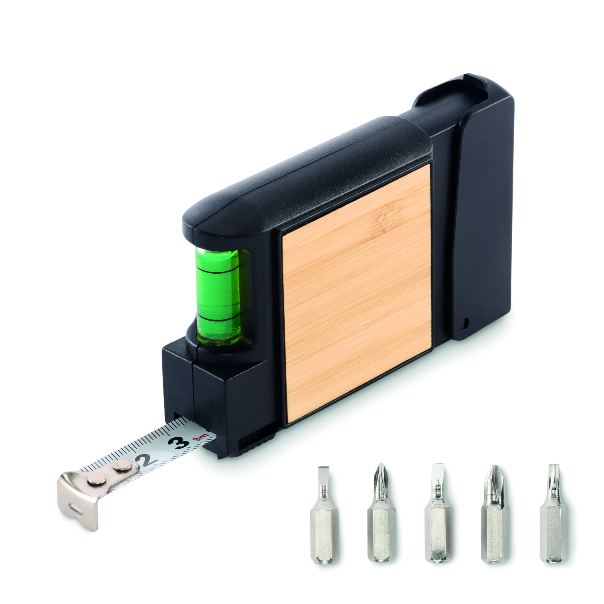 3M daudzfunkcionāla mērlente ar bambusa detaļām, ieskaitot līmeņrādi un skrūvgriežu komplektu ar 5 uzgaļiem.