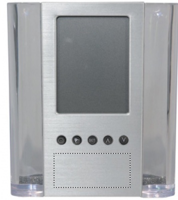 Pildspalvu turētājs ar kalendāra modinātāju un termometru. Komplektā 1 šūnu akumulators.