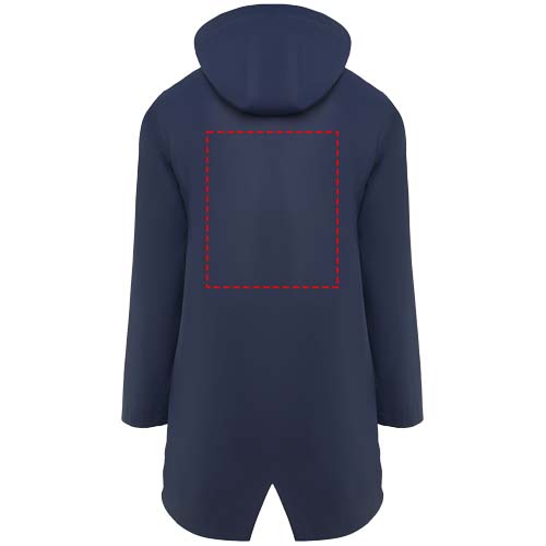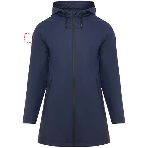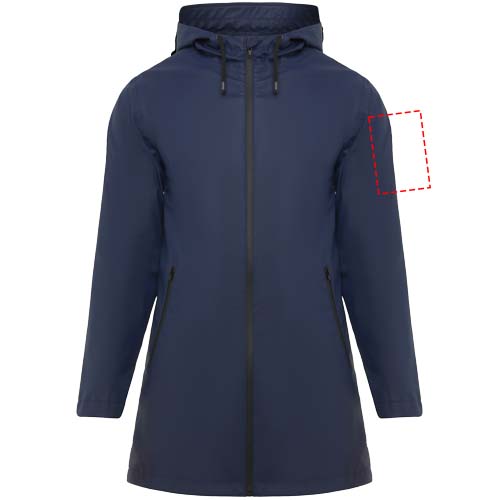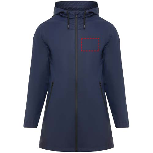 Ūdensizturīgs lietusmētelis sievietēm. Kapuce ar smaili. Termiski noslēgti rāvējslēdzēji un šuves. Kontrastējošas detaļas melnā krāsā. Divas sānu kabatas ar rāvējslēdzēju. Šķēlums aizmugurējā apakšmalā. Noņemama etiķete. Ūdensizturīgs. Modelis ir 179 cm garš un valkā S izmēru.