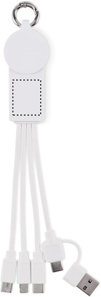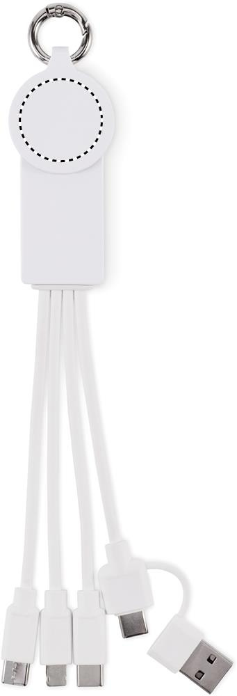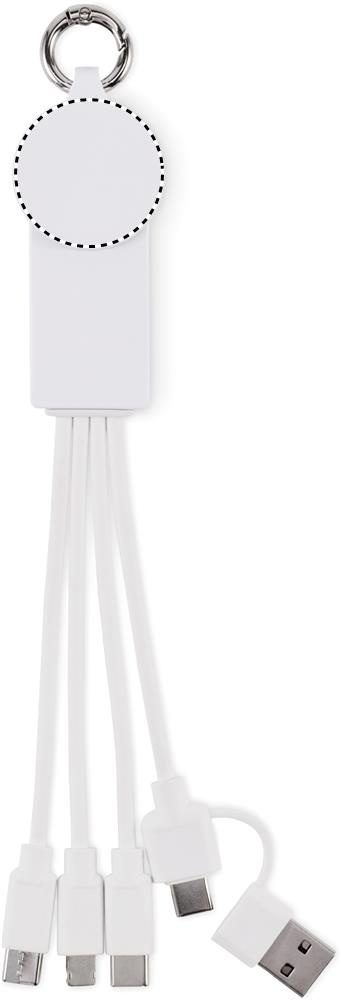 Key ring with charging cable with input: 2-in-1 type-C & type-A. Output: Watch charging (Samsung® and Apple®), 2 x type-C and micro-B (2 in 1 pin). Cable made of recycled TPE.