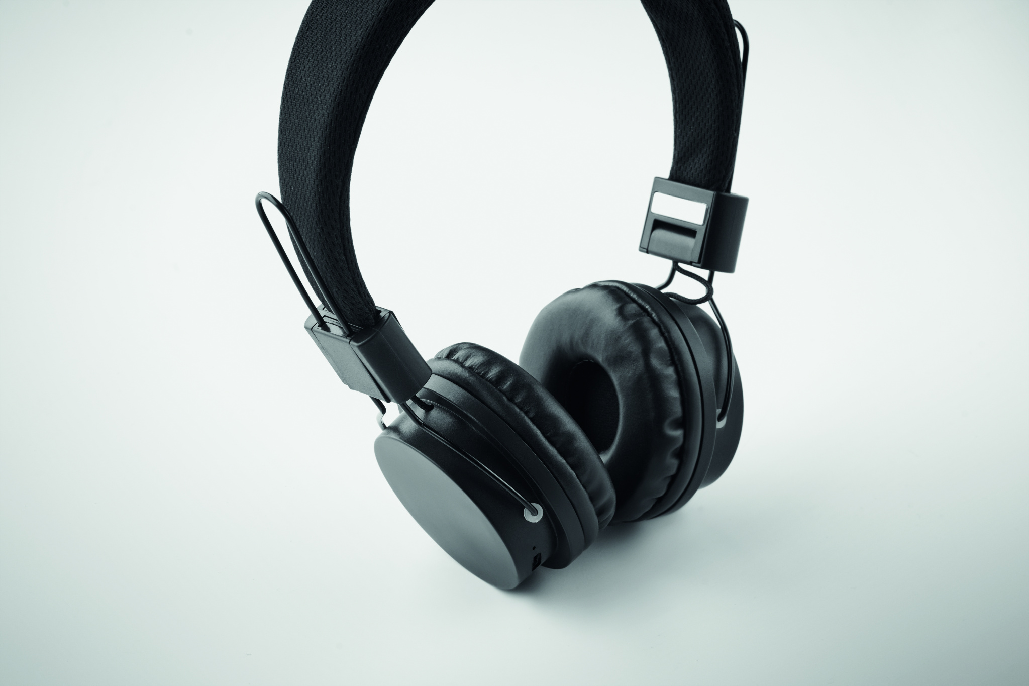 5.3 wireless foldable headphones in ABS. Hands free function and built-in microphone. Playing time approx. 9 hours. Includes micro USB charging cable. Rechargeable 400 mAh Li-ION battery. Operating range: 10 m.