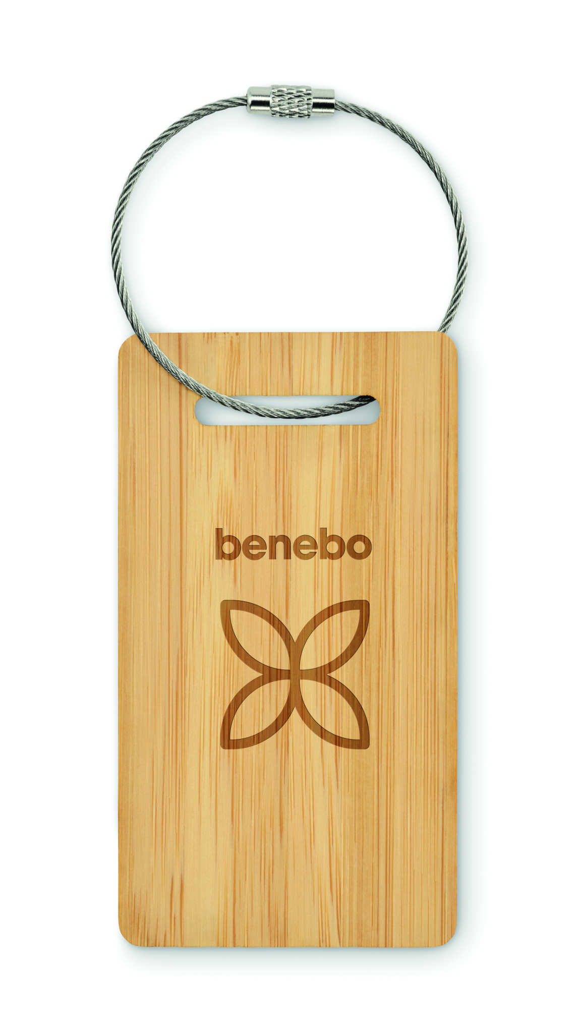 Bamboo luggage tag with stainless steel rope.