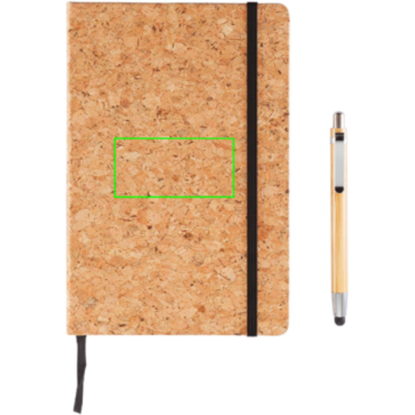 ЭКО-блокнот из натуральной пробки с 160 страницами бумаги плотностью 80 г/м2. С черным разделителем страниц и черной резинкой. Включает бамбуковую ручку со стилусом и шариковую ручку.