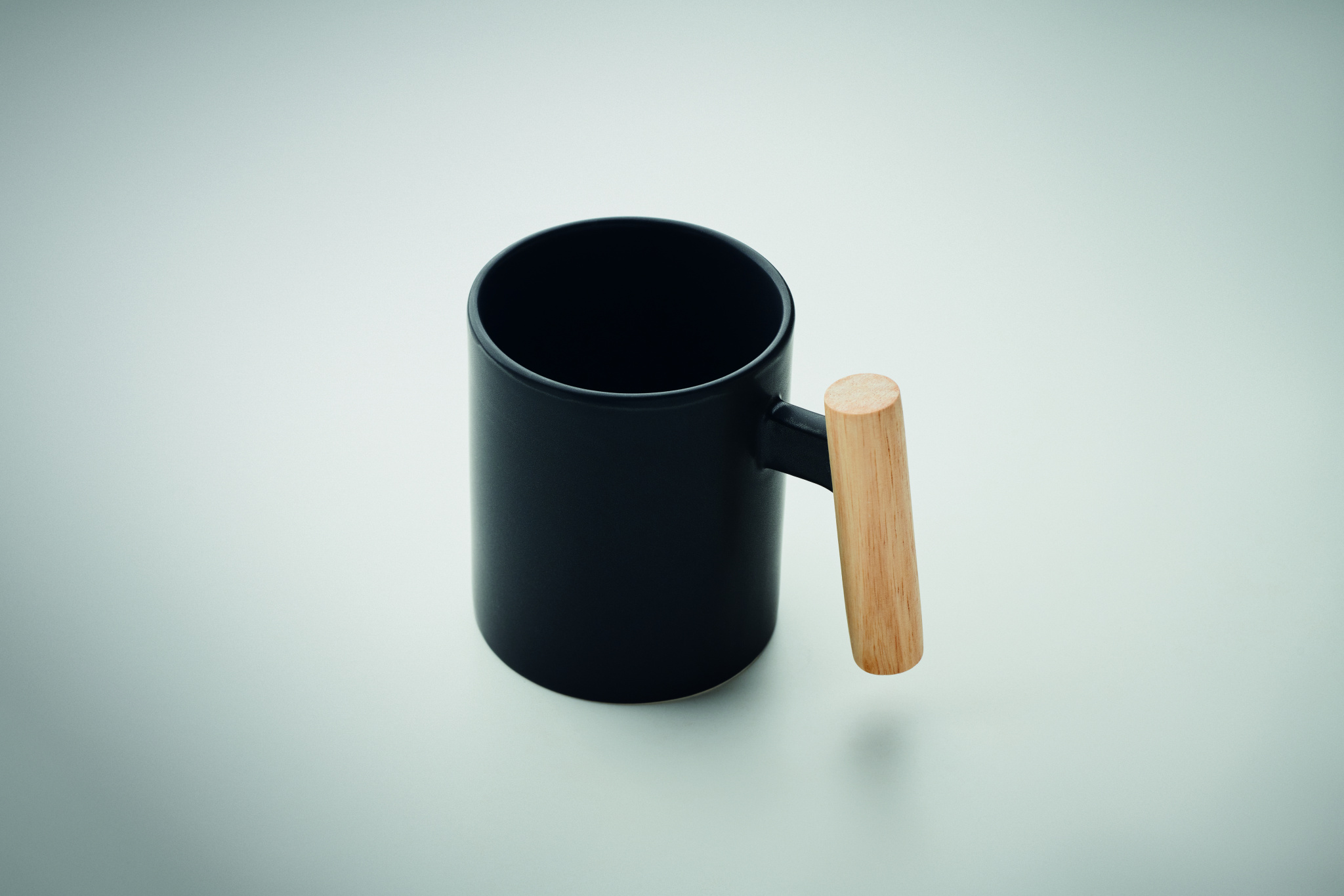 Ceramic mug with wooden handle. Capacity: 320ml. Individual packed in white carton box. Hand wash only.