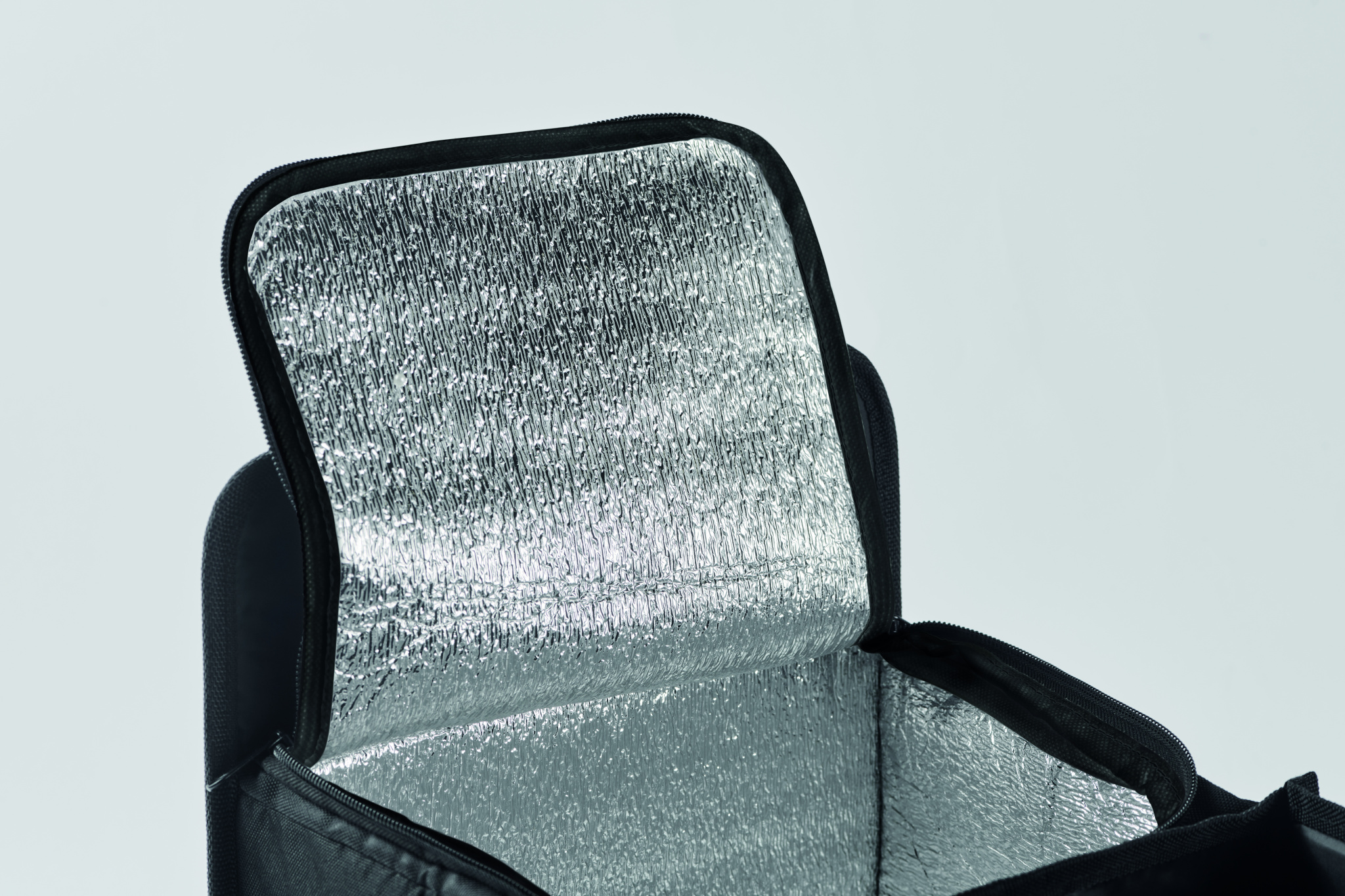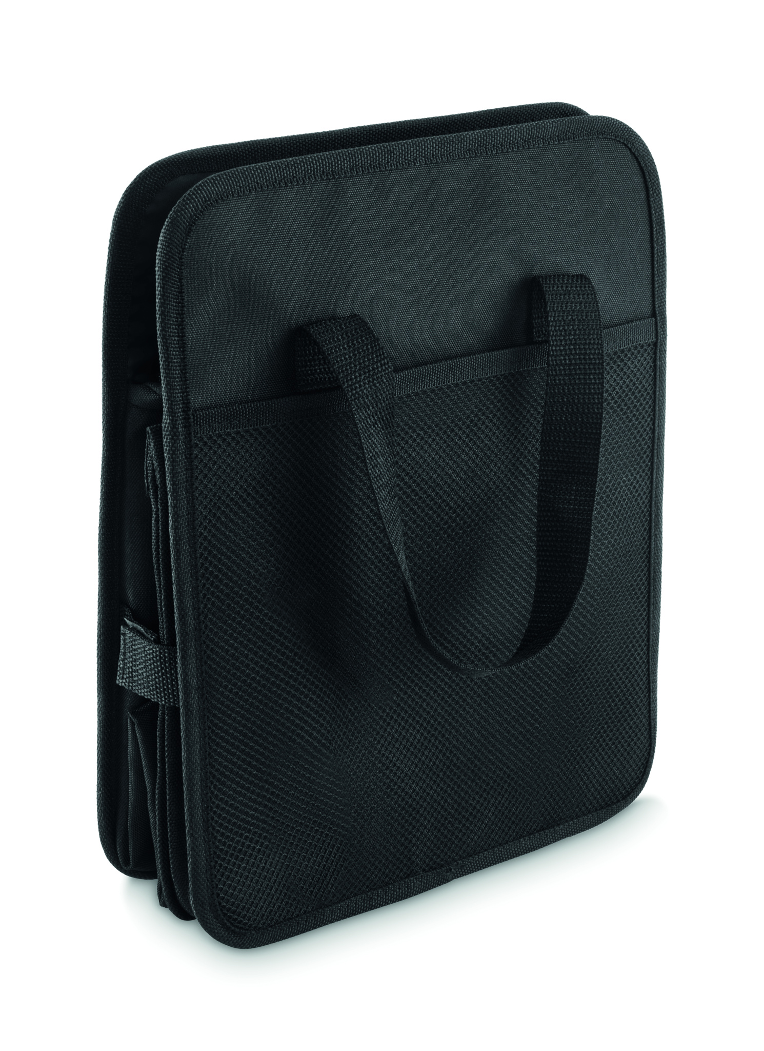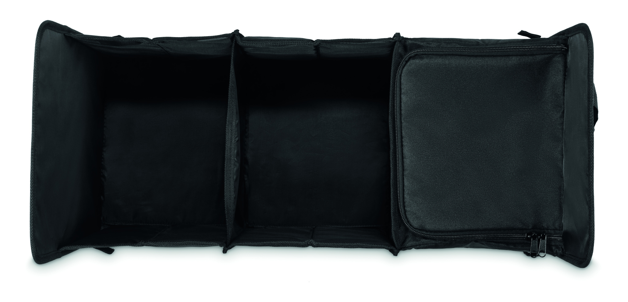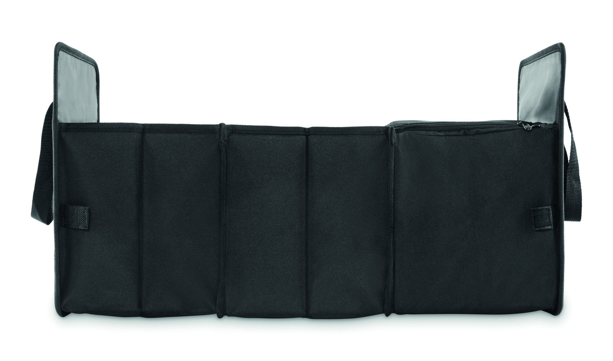 Foldable car organizer in 600D RPET polyester with 3 compartments of which one cooler compartment.